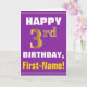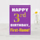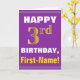 This simple birthday-themed greeting card design features a warm birthday wish like "HAPPY 3rd BIRTHDAY, First-Name!" on the front, in bold text on a purple colored background. The birthday number has a faux/imitation gold-like coloring look. The name on the front can be customized. The inside features a customizable birthday message. A greeting card like this could be a fun way to deliver birthday wishes to somebody who is celebrating their third birthday. [~Z0000277]