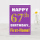 This simple birthday-themed greeting card design features a warm birthday wish like "HAPPY 67th BIRTHDAY, First-Name!" on the front, in bold text on a purple coloured background. The birthday number has a faux/imitation gold-like colouring look. The name on the front can be personalised. The inside features a birthday message that can be personalised. A greeting card like this could be a fun way to deliver birthday wishes to somebody who is celebrating their sixty seventh birthday. [~Z0000277]