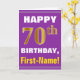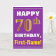 This simple birthday-themed greeting card design features a warm birthday wish like "HAPPY 70th BIRTHDAY, First-Name!" on the front, in bold text on a purple colored background. The birthday number has a faux/imitation gold-like coloring look. The name on the front can be personalized. The inside features a birthday message that can be customized. A greeting card like this could be a fun way to deliver birthday wishes to somebody who is celebrating their seventieth birthday. [~Z0000277]