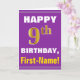 This simple birthday-themed greeting card design features a warm birthday wish like "HAPPY 9th BIRTHDAY, First-Name!" on the front, in bold text on a purple coloured background. The birthday number has a faux/imitation gold-like colouring look. The name on the front can be personalised. The inside features a birthday message that can be customised. A greeting card like this could be a fun way to deliver birthday wishes to somebody who is celebrating their ninth birthday. [~Z0000277]