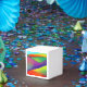 Digital watercolor landscape design in vibrant rainbow colours and textures with a curved hills and lines.