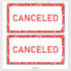 Bold red and white cancelled notice stickers with the American spelling with one 'L'
