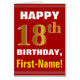 This simple birthday-themed greeting card design features a warm birthday wish like "HAPPY 18th BIRTHDAY, First-Name!" on the front, in bold text on a red coloured background. The birthday number has a faux/imitation gold-like colouring appearance. The name on the front can be customised. The inside features a customisable birthday message. A greeting card like this could be a fun way to deliver birthday wishes to somebody who is celebrating their eighteenth birthday. [~Z0000276]