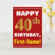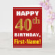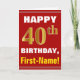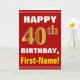 This simple birthday-themed greeting card design features a warm birthday wish like "HAPPY 40th BIRTHDAY, First-Name!" on the front, in bold text on a red coloured background. The birthday number has a faux/imitation gold-like colouring appearance. The name on the front can be personalised. The inside features a customisable birthday message. A greeting card like this could be a fun way to deliver birthday wishes to somebody who is celebrating their fortieth birthday. [~Z0000276]