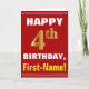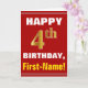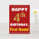 This simple birthday-themed greeting card design features a warm birthday wish like "HAPPY 4th BIRTHDAY, First-Name!" on the front, in bold text on a red coloured background. The birthday number has a faux/imitation gold-like colouring look. The name on the front can be personalised. The inside features a birthday message that can be customised. A greeting card like this could be a fun way to deliver birthday wishes to somebody who is celebrating their fourth birthday. [~Z0000276]