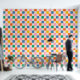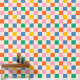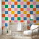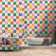 This super fun wallpaper features a maximalist chequerboard pattern in orange, yellow, kelly green, pink, blue, and ivory. Great for kids' bedrooms or bathrooms or for the kid at heart!