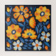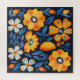 This stunning floral illustration features oversized, retro-inspired flowers in shades of orange, yellow, blue, and cream against a dark background. The stylised, cartoon-like blossoms create a playful yet bold design