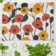 The image features a vibrant floral pattern with stylised red and orange flowers, each with bold black centres. The flowers are connected by thin black stems and leaves, all set against a light background. The design is minimalistic yet striking, evoking a retro or mid-century modern aesthetic with its clean lines and contrasting colours.