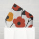The image features a vibrant floral pattern with stylised red and orange flowers, each with bold black centres. The flowers are connected by thin black stems and leaves, all set against a light background. The design is minimalistic yet striking, evoking a retro or mid-century modern aesthetic with its clean lines and contrasting colours.
