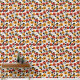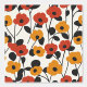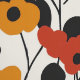 The image features a vibrant floral pattern with stylised red and orange flowers, each with bold black centres. The flowers are connected by thin black stems and leaves, all set against a light background. The design is minimalistic yet striking, evoking a retro or mid-century modern aesthetic with its clean lines and contrasting colours.
