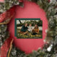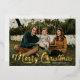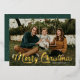 Stylish holiday card featuring your horizontal photo on the front with "Merry Christmas" displayed in a bold gold foil script overlay. Personalise the front of the photo Christmas card with your family name and the year. The foil holiday card reverses to display an additional photo framed in white with a dark green background with subtle white dots.