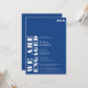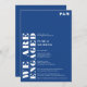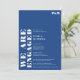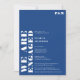 Bold simple white blue wedding engagement party with "we're engaged" written in oversized bold font in white
