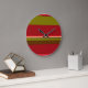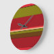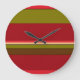 This simple yet decorative wall clock features a colorful retro abstract pattern of bold geometric stripes in colors of red, orange, brown, olive green, black and tan.