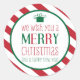 This cute Christmas sticker design by The Spotted Olive™ features bold red & white stripes, a graphic of a present and the words "We wish you a Merry Christmas and a Happy New Year" set in fun typefaces. Adorable! Copyright © 2014 The Spotted Olive™. All Rights Reserved.