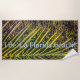 This Beach Towel features original, abstract artwork by ZoeSPEAK, made from an original photograph of a reclinata palm frond. The strong Florida sun highlights the leaves, which grow out from the spine like stripes in diagonal rows. The lawn, in soft focus, forms the green background. There is optional text reading “Life’s a Florida beach!”, which can be personalised or deleted if you prefer.
