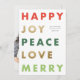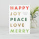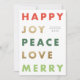 A modern typographic holiday card featuring bold, bright type in a variety of colours and gold foil and a full bleed customer photo on back.
