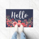 Fancy pink watercolor floral wreath and dark navy blue background featuring a hand lettered white "hello" in script. This doormat screams fun plus femininity and would make a great impression on your house guests as they are welcomed to your home!