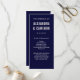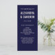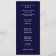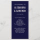 This modern wedding program features blush pink text on a navy blue background.