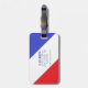 Luggage tag with a flying saucer and text|"Bon Voyage" that can be personalised. This flying saucer has blue white and red stripes as a background. Stand out from the crowd with this lovely next generation lugagge tag.
