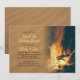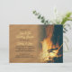 Bonfire invitation template for a wedding shower. Sand background with burning fire image on horizontal cards. Template text is black printed text with yellow script for celebration title and names of honorees.