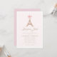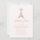 Elegant baby shower invitation featuring a charming Paris Eiffel Tower illustration topped with a delicate pink bow and soft blush tones. Inspired by classic French style, this design blends timeless elegance with sweet, feminine charm.