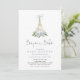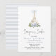 Bonjour Bebe Paris French Blue Eiffel Baby Shower Invitation features golden Eiffel Tower with blue bow on top and blue flowers with greenery. Back of invitation features baby blue stripes.