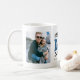 Modern, trendy two photo mug features typography script ''best bonus dad ever'' in navy blue and black, 2 photos and kids names. Perfect gift for step dad for father's day, Christmas etc.