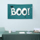 Boo! text design for Halloween with cat, spider, owl and spider net decoration on grunge blue background.