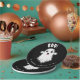 Destei's cartoon illustration of a cute ghost character with big eyes and a happy expression. The background colour is black and there are two personalizable text areas. One of the text templates reads: "Boo!" while on the other one there is space for a custom party name, for example. This personalizable design is ideal for the spooky season.