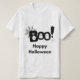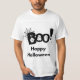 A fun and cheerful men's white t-shirt featuring the playful quote "Boo Happy Halloween" in stylish black letters.three small white ghost illustrations cleverly integrated inside the letters, so make ur Halloween party special by wearing this modern t shirt.