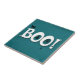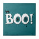 Boo! text design for Halloween with cat, spider, owl and spider net decoration on grunge blue background.