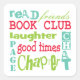 Fun colourful graphic design features words about a Book Club. Friends, page, chapter, laughter, chat, and good times. Makes a great gift for birthday, hostess or holiday.
