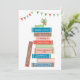 This modern and colourful invitation is ideal to celebrate a Baby Shower with a “Bring a Book for Baby” theme. It features a stack of books with a cute bookworm on top wearing big glasses and a bowtie. A pennant on top adds a festive look. This unisex invitation will help you build the baby’s library white hosting a stylish event.