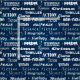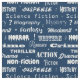 Fun yet stylish dark blue fabric with a typographic print of different book genres in white text.
