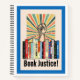 Protest banning books with this image that features a shelf of banned books, a protesting raised fist, a burst of colour rays and the words "Book Justice" in a retro font. Accented by a border of rich blue. Looks great!
