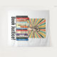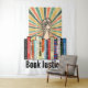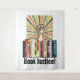 Protest banning books with this image that features a shelf of banned books, a protesting raised fist, a burst of colour rays and the words "Book Justice" in a retro font. Accented by a border of rich blue. Looks great!