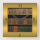 This Book Lover's Square Gold Clock will make an appealing addition to your kitchen or den. The design features a digital oil rendition of a filled bookshelf. A gold frame includes easy to read numbers. This clock will make a unique gift for anyone who has a passion for reading.