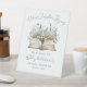 A charming welcome sign for a bridal shower inspired by the “A New Chapter Begins” theme. Centered on the sign is a watercolor open book with wildflowers and greenery spilling out, featuring soft blush pink, yellow, blue, and purple tones for a light and cheerful look.