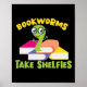 This funny book lover & reading teacher design reads "bookworms take shelfies".The design features a bookworm.