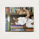 Two cute cats asleep on book shelves filled with fun cat books. Cat loving avid book reader.