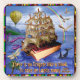 This beautiful, original fantasy coaster set is based around the Emily Dickinson poem that begins, "There is no Frigate like a Book To take us Lands away." The quote appears at the bottom, below a masted sailing ship made of an antique book. The words from the poem are scrawled throughout. They're torn-looking on the sails, they wrap around the balloon in the distance, and they decorate the wings of a dragonfly that has a pencil body. They even faintly appear on the faded rainbow. Meanwhile, book seagulls fly away while a killer whale and a purple squid surround the book ship. It's a pretty, surreal scene for any book lover, avid reader, writer, English teacher, librarian or bookstore owner. The background is bordered in a bookshelf pattern