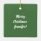 Features an illustration of a festive bookmobile. The dark red vehicle is decorated with Christmas lights and has a Christmas tree on the roof. On the back of this ornament is a spot to add your own custom message in white script or cursive writing.