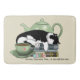 A cute black and white cat sleeping on a pile of books with a green teapot and a cup of tea.