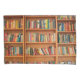 School library educational books on a brown wooden bookshelf for teachers, students and bookworms.