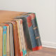 School library educational books on a brown wooden bookshelf for teachers, students and bookworms.
