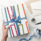 This wrapping paper has a mid-century modern design of repeating rectangles in teal, orange, beet and orange on a field of white. If you like the design but prefer different colours, message me.
