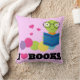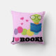 Cute pillow for a book lover has I Love Books quote and a colourful bookworm, perfect as a gift for Book Club members.