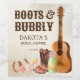 Boots and bubbly western cowgirl rodeo country brunch bridal shower personalised wine labels. Cowgirl boots, sparkling wine, sparkling wine glasses, a ring, guitar, horseshoe for a western country rustic cowgirl bridal shower.
