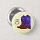 Cowboy boots with age template birthday button. Blue and brown western boots on a beige pin with a template area for adding age. Barbed wire font. Suitable for boys or girls.
