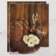 The informal yet elegant equestrian theme Cowboy Boots, Daisies and Horse Bit Country Western Wedding Menu can be customised with the details of the meal that you will serve at your rustic ranch engagement party, bridal shower luncheon, marriage reception or wedding brunch by adding the salad or first course, entree or second course and dessert or third course. This charming custom equine theme wedding menu features a quaint floral photograph of a pair of cowboy boots, a bouquet of white and yellow daisy flower blossoms, white pearl necklace, horse bit and leather reins with a brown weathered barn wood background. Perfect inspo for a casual farm style barn party celebration event.
